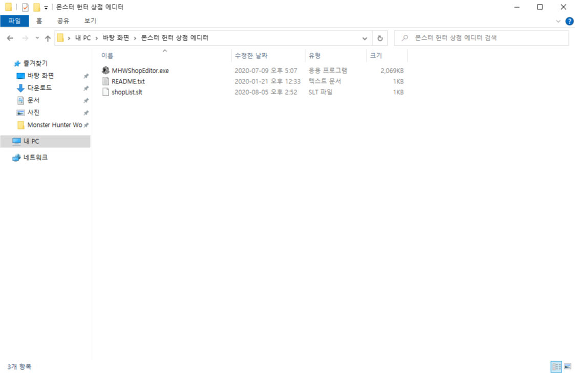 압축을 해제하신 후 안에 있는 'MHW Shop Editor'를 실행해주세요.